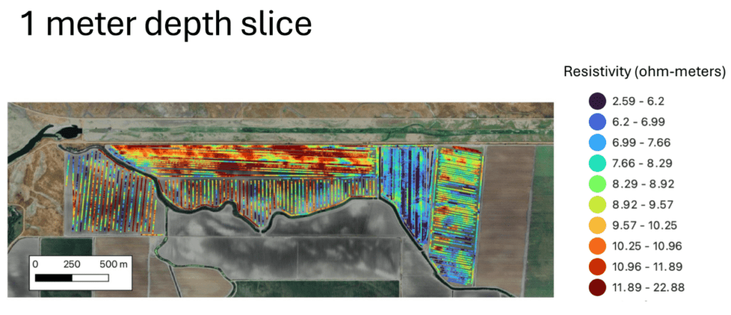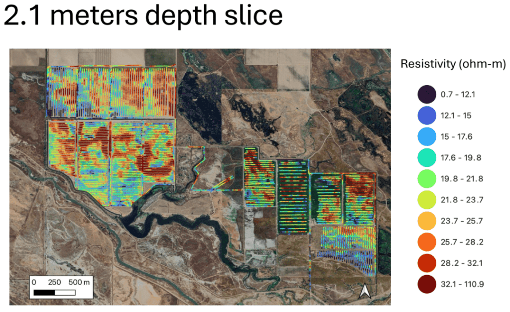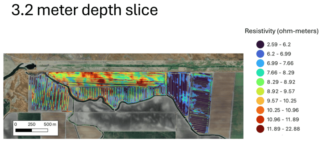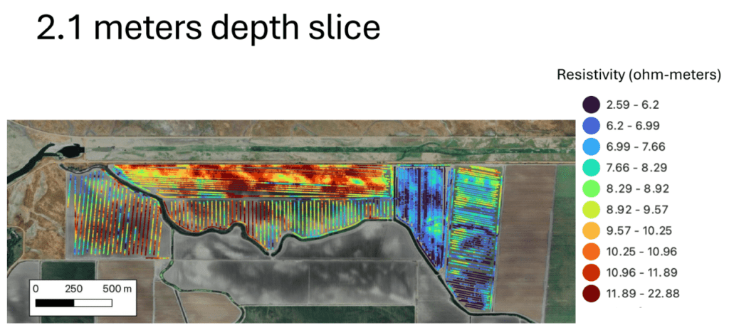 Beyond 2.1 meters deep, Sweetwater reveals mostly low-resistivity values with salinity issues, which could be due to fertilizer use or the sediments are naturally a little saltier, another hallmark of the bottomlands of the San Joaquin.