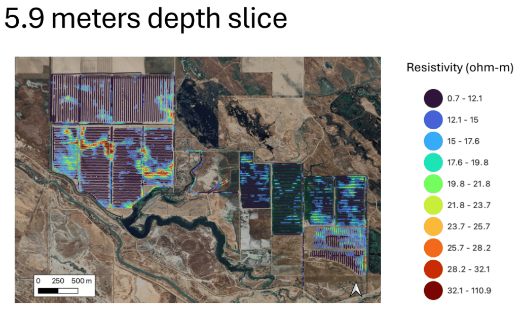 At 5.9 meters deep, the increased amount of low resistivity values (indicated by the dark gray) caught Prentice’s eye. This doesn’t necessarily indicate it’s all clay, because resistivity will also decrease if there’s higher salinity—which can be caused by fertilizers.