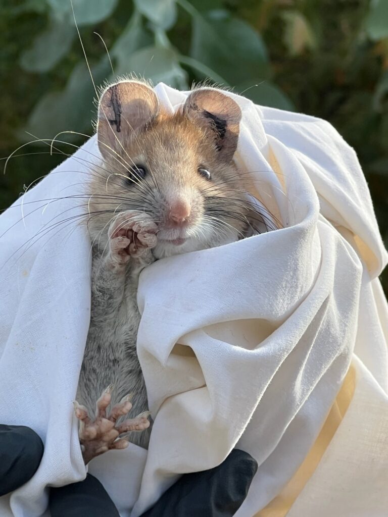 While approaching the traps, they could see something inside, and it wasn’t what they expected. In the traps were riparian woodrats, (from left to right) an adult male, an adult female, and a juvenile. Also an endangered species, these woodrats were “bycatch,” meaning they were captured while the focus was on a different species, RBRs.