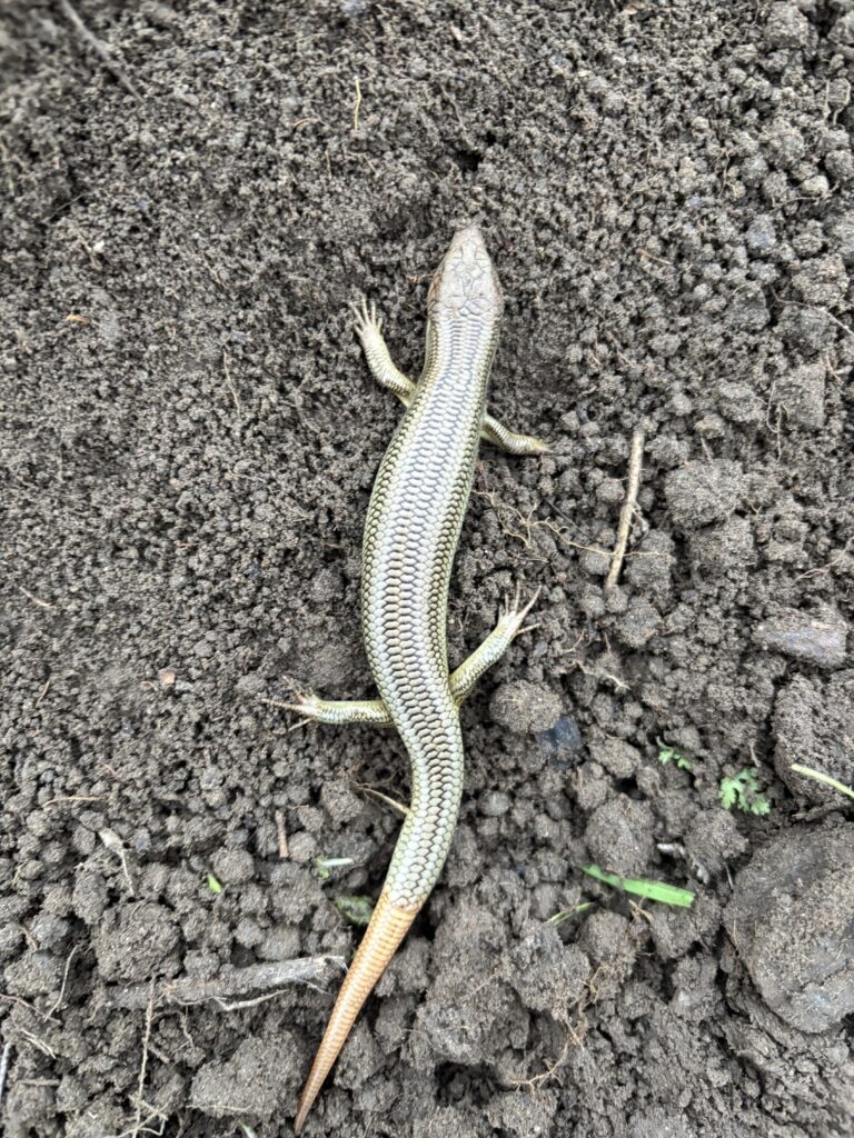 Seasonal Restoration Scientist Ciara Cipponeri and other Science team members were at River Partners’ 2,826-acre Great Valley Grasslands State Park revitalization project along the San Joaquin River in Merced County. An effort led by American Rivers and supported by California State Parks, we used heavy equipment to strategically (and carefully) remove sections of an old, unused levee system to restore a long-disconnected section of the river’s floodplain. Keeping an eye on the soil disturbed by a bulldozer, Cipponeri spied this secretive Gilbert’s skink and moved it to safety.