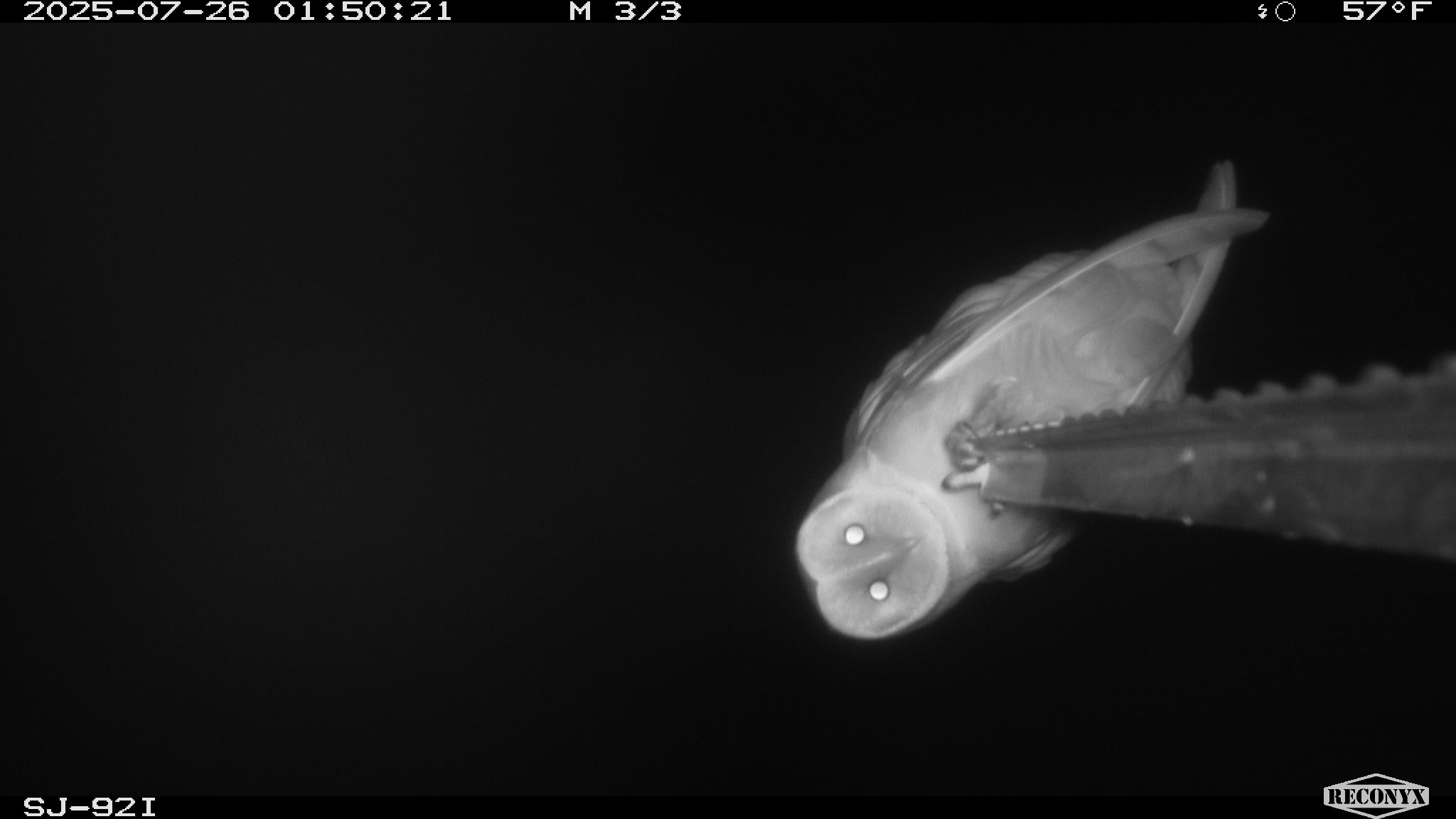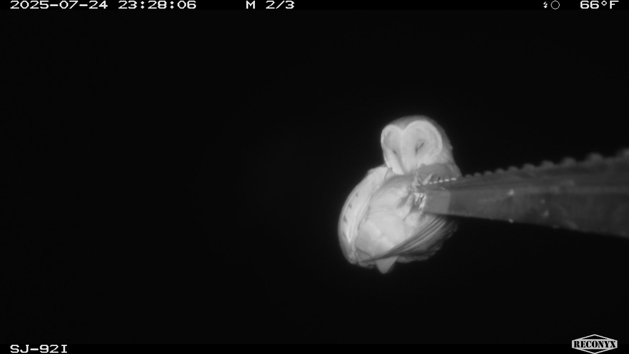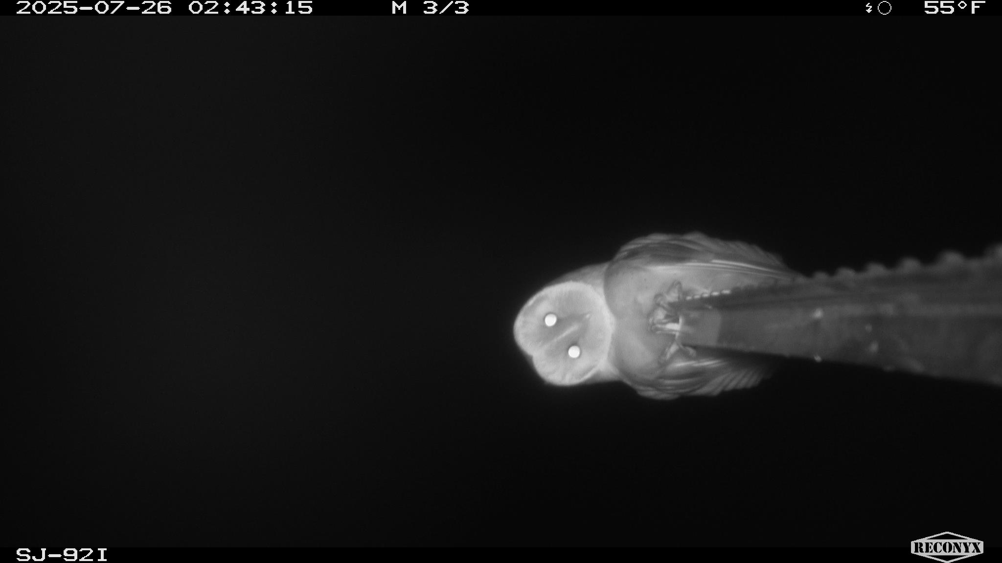 At the 965-acre Tule Elk State Natural Reserve in Kern County, River Partners is working to conserve and enhance critical habitats for the imperiled tule elk. Located about 25 miles west of Bakersfield, the Reserve also supports a vast array of other wildlife, as evidenced by the ghostly, pale visage of a barn owl looking directly into one of our camera traps. The owl seems to like this perch, as it was photographed on two different nights, including once likely preening after enjoying a tasty dinner.