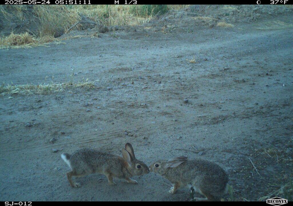 It’s a chilly May morning, and you’re a desert cottontail traipsing around Hidden Valley Ranch, a 350-acre former dairy near Modesto that River Partners restored in 2024 as a vital puzzle piece in one of the state’s largest contiguous corridors of floodplain habitat. It’s also peak breeding season—and you’ve just found yourself a possible mate. You communicate with the other desert cottontail, touching noses, a primary way to communicate. We’ll never know what happened with this pair, but we do know that one of our camera traps captured this courtship ritual.