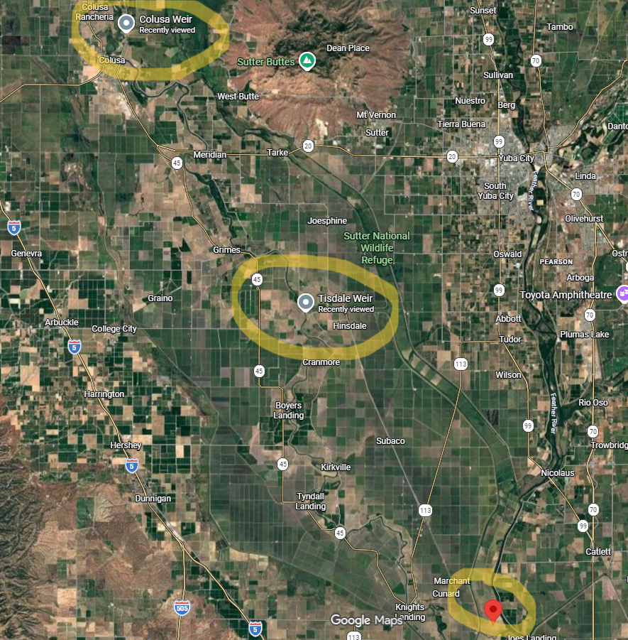 We know juvenile salmon use the floodplain here. The question is where they enter it and if River Partners can help make that easier for them by providing a more accessible on-ramp. The assumption was that most fish which end up in the lower Sutter Bypass from the Sacramento River enter it when the Colusa or Tisdale Weirs overtop (see map below). However, initial JSAT results indicate otherwise.